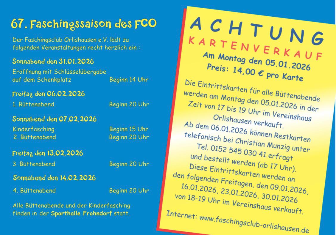 Die Eintrittskarten für alle Büttenabende werden am Montag, den 05.01.2026 in der Zeit von 17:00 bis 19:00 Uhr im Vereinshaus Orlishausen verkauft.